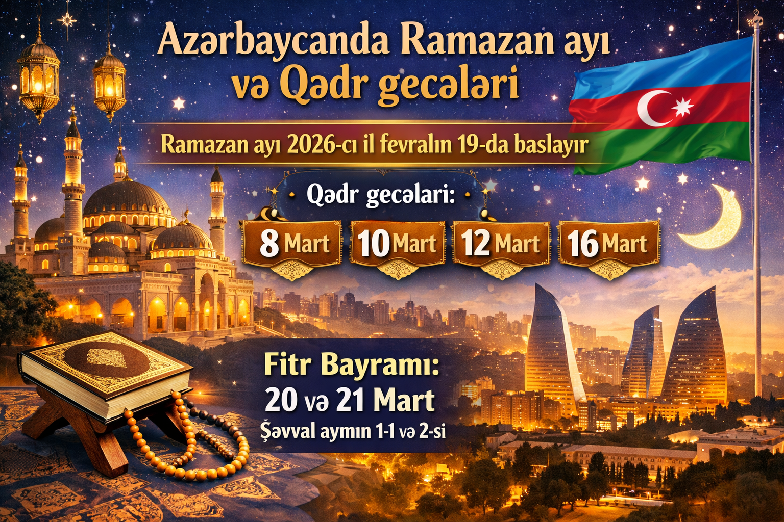 Azərbaycanda Ramazan ayı başlayır [xfvalue_red] 3 Ock, 26 - 18:09 2026-cı il fevralın 19-da Azərbaycanda Ramazan ayı başlayacaq.Qədr gecələri isə martın 8-i, 10-u, 12-si və 16-sı qeyd olunacaq.Şəvval ayının 1-i və 2-si (martın 20-si və 21-i) Azərbaycanda Ramazan (Fitr) bayramı münasibətilə qeyd olunacaq.