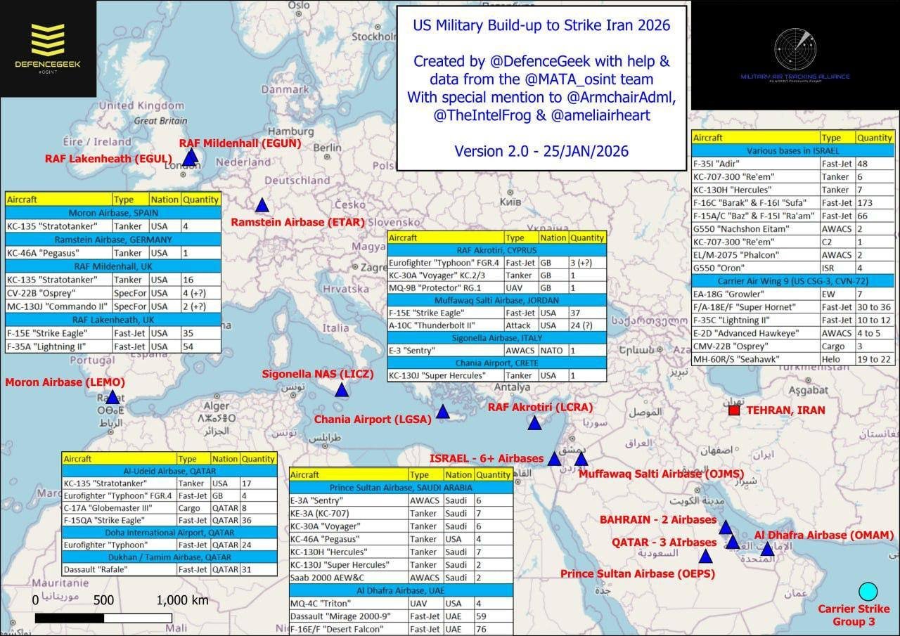 Xəritə ABŞ-ın İran ətrafında hərbi gücünü genişləndirməsinin miqyasını göstərir. Avropa və Yaxın Şərqdə qırıcı təyyarələr, yanacaqdaşıyan tanker təyyarələri, AWACS (erkən xəbərdarlıq və idarəetmə) sistemləri və aviadaşıyıcıların hava qanadları yerləşdirilib.
