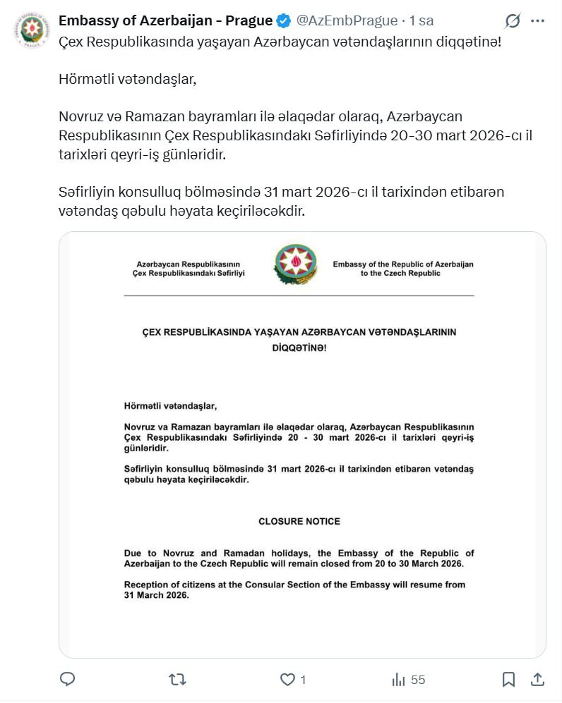 Azərbaycan Respublikasının Çexiya Respublikasındakı Səfirliyi konsulluq xidmətlərinin göstərilməsində fasilə yaranacağı ilə bağlı vətəndaşlara xəbərdarlıq edib.