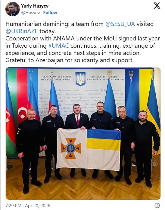 Qanuntv.az xəbər verir ki, bu barədə Ukraynanın Azərbaycandakı səfiri Yuri Qusev “X” sosial şəbəkə hesabında paylaşım edib.
