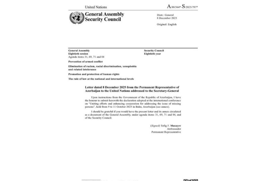 Azərbaycan Respublikası Əsir və itkin düşmüş, girov götürülmüş vətəndaşlarla əlaqədar Dövlət Komissiyasının təşkilatçılığı ilə 2025-ci il oktyabrın 9-11-də Bakı şəhərində keçirilən “İtkin düşmüş şəxslər məsələsinin həlli üçün səylərin birləşdirilməsi və əməkdaşlığın gücləndirilməsi” mövzusunda beynəlxalq konfransda qəbul edilmiş bəyannamə BMT Baş Assambleyasının və Təhlükəsizlik Şurasının rəsmi sənədi kimi dərc olunub və yayılıb.